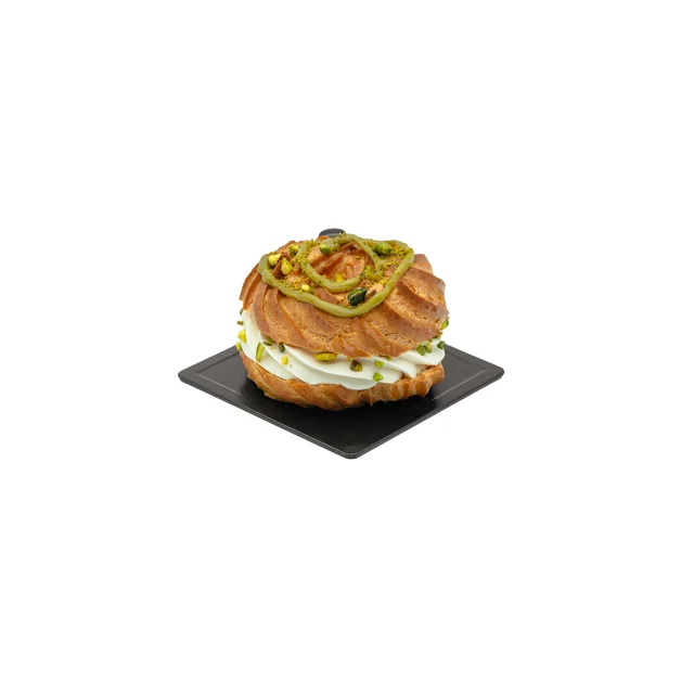 یک شاهکار شیرینیپزی با الهام از کلاسیک پاریس برست، حالا با طعم فوقالعاده پسته! این دسر خوشمزه از خمیر شوکت وانیلی، گاناش مونته وانیلی، پرالین پسته، پودر پسته و پسته تازه تشکیل شده و هر لقمه آن ترکیبی از کرمی لطیف و بافتی خوشمزه با طعم پسته واقعی را به شما هدیه میدهد.